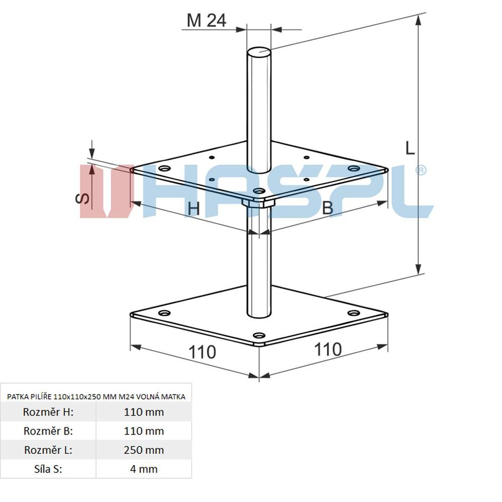 - Náš sklad - Patka pilíře 110 x 110 x 250 mm 4 mm M24 volná matka